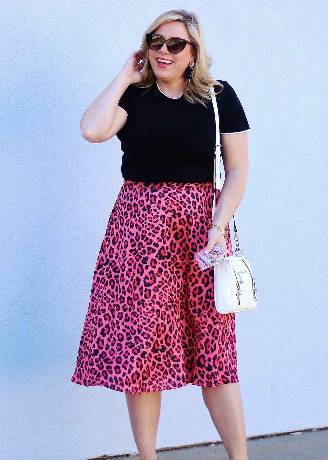 Sweater {c/o JCPenney} Pink Leo Print Skirt {c/o JCPenney} Black Pumps {similar Here & Here} White Crossbody Handbag similar {Here} Cat eye sunglass {c/o JCPenney} Be the Boss Red Orange Lipstick {c/o JCPenney}